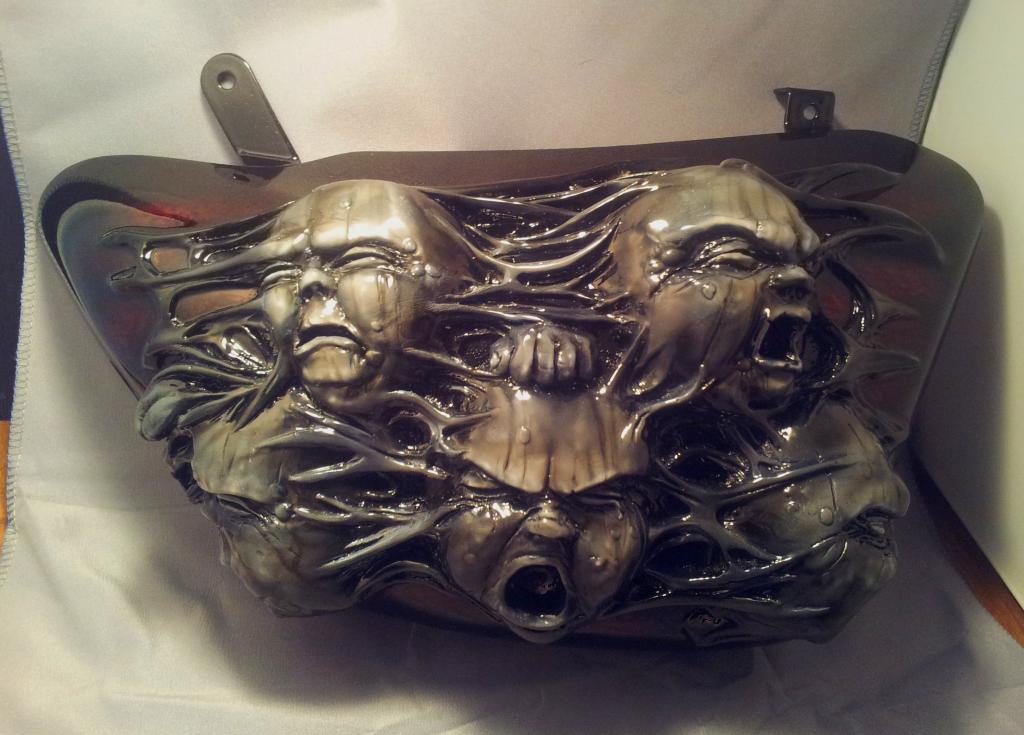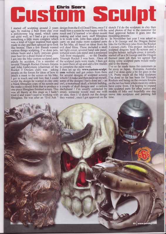 I'm based in Tamworth, Staffs, and make custom screens, headlight units, panels or add on sculpture for bikes and cars, I take and original panel and make a fibreglass copy of that panel, then sculpt on it to produce a master which I then make a mould from to produce the finished piece. Screens are my most popular request at the moment - see below for pics, I can also make sculpture to attach to tanks, tail units and mudguards or complete parts in fibreglass such as side panels. I can also make hood ornaments in fibreglass and add ons to spoilers for cars vans etc